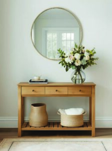 L’entrée, seuil symbolique entre deux mondes, mérite une attention particulière. Miroirs étincelants et bouquets colorés